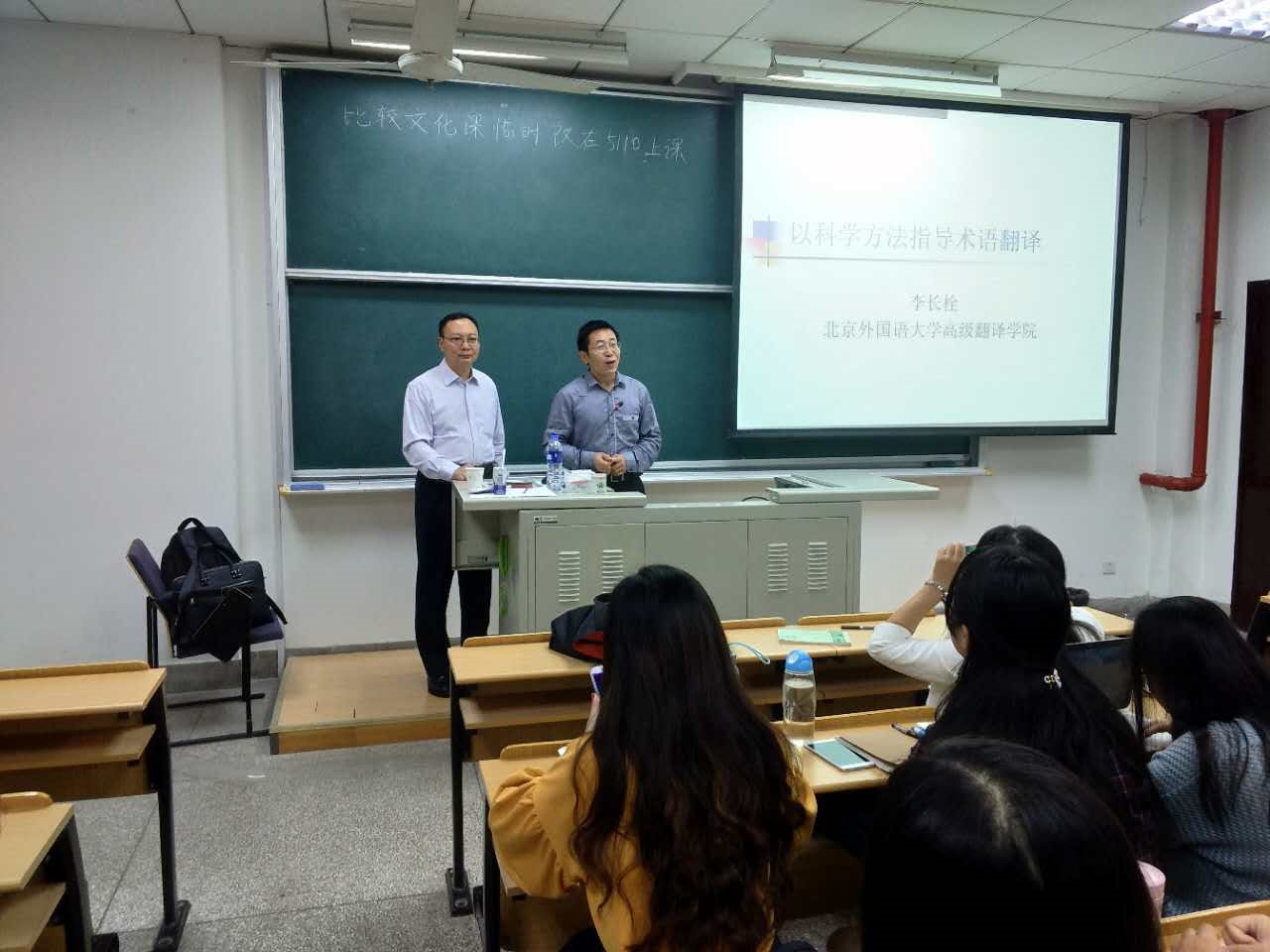 2017年10月11日上午,由安博app登录_安博(中国),外文学院主办的系列讲座之第二场在第五教学楼正式开讲啦!现场气氛热烈,座无虚席,许多对翻译研究感兴趣的小伙伴们都早早慕名前来,以期感受北外高翻名师李长栓老师的风采。李老师继昨晚所作的题为“翻译是发现和再现真相的过程”的讲演后,又紧接着奉献了一场紧扣“以科学方法指导术语翻译”为主题的演说。本场讲座由王炎强老师担任主持。