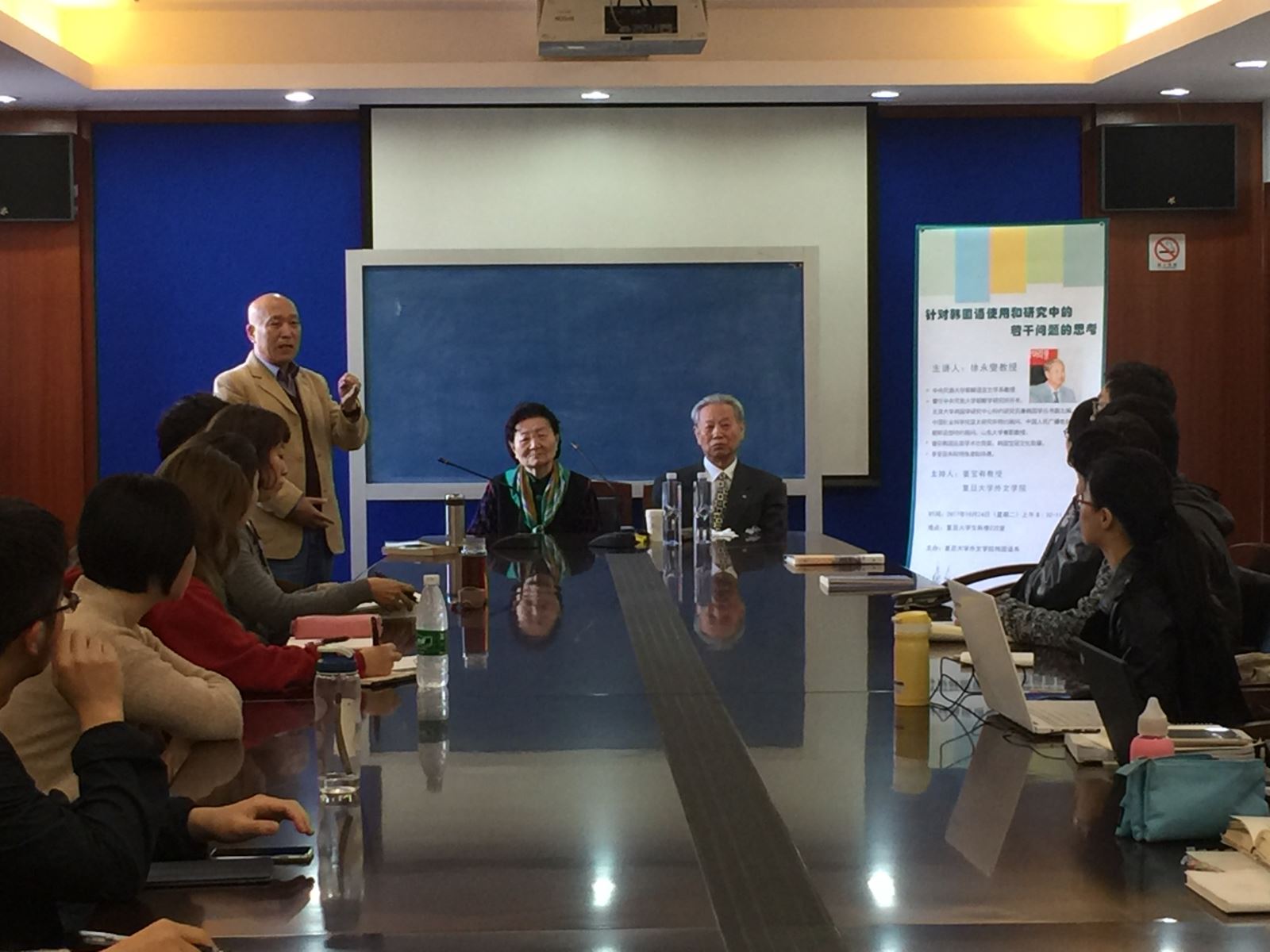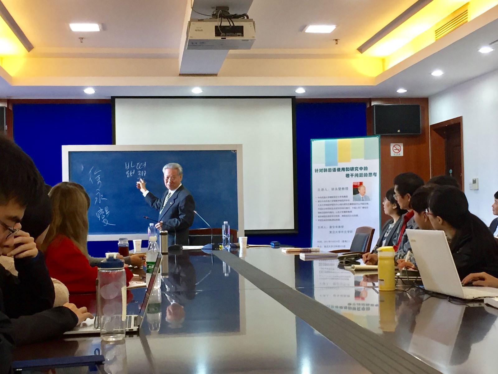 2017年10月24日上午,中央民族大学朝鲜语言文学系徐永燮教授应邀做客安博app登录_安博(中国),,在安博app登录_安博(中国),文科楼220报告厅为韩文系师生带来精彩的讲座。徐永燮教授以“针对韩国语使用和研究中的若干问题的思考”为主题开展讲座。讲座由韩文系姜宝有教授主持。