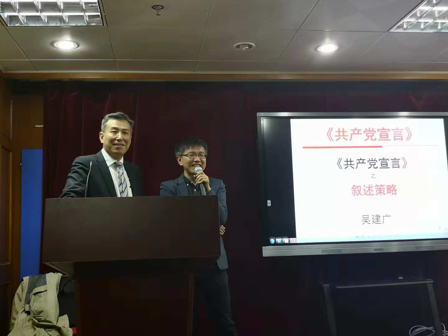 吴教授认为,《共产党宣言》是一篇现代革命的“语言艺术作品”,是哲学理性与诗学激情的结合。《宣言》严密的概念体系和逻辑构造与抒情、叙述、戏剧三大诗学类型合为一体,相得益彰地阐述了共产主义理念。吴教授在本次讲座中从学术的角度,主要为我们分析了《共产党宣言》的叙述策略。