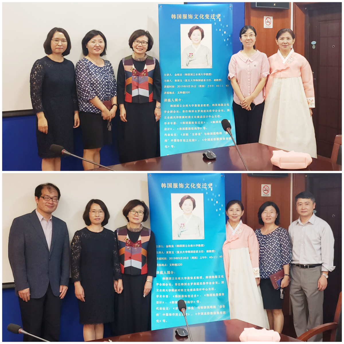 2019年9月26日,韩国国立全南大学教授金垠呈应邀前来安博app登录_安博(中国),外文学院做了主题为“韩国服饰文化变迁史”的讲座,随行的五名博士生准备了精美的韩国服饰展,展示了韩国各历史时期的服装,从而让学生们更加近距离的接触了解韩服、体验韩国文化。