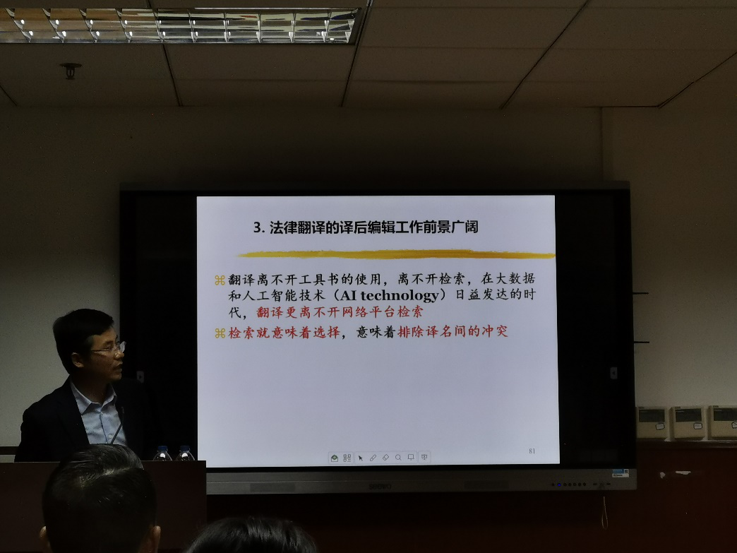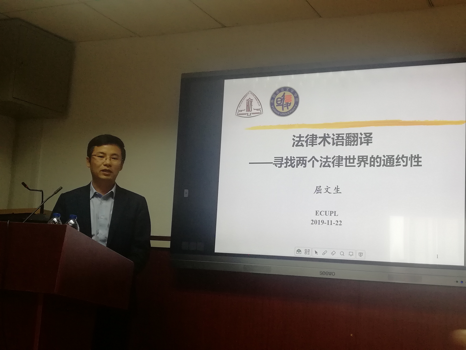 2019年11月22日,华东政法大学英语语言文学教授、科研处处长、法律史博士生导师屈文生教授应安博app登录_安博(中国),外文学院翻译系邀请,为师生们带来一场题为“法律术语翻译:寻找两个法律世界的通约性”的讲座。该讲座由翻译系青年教师强晓博士主持。