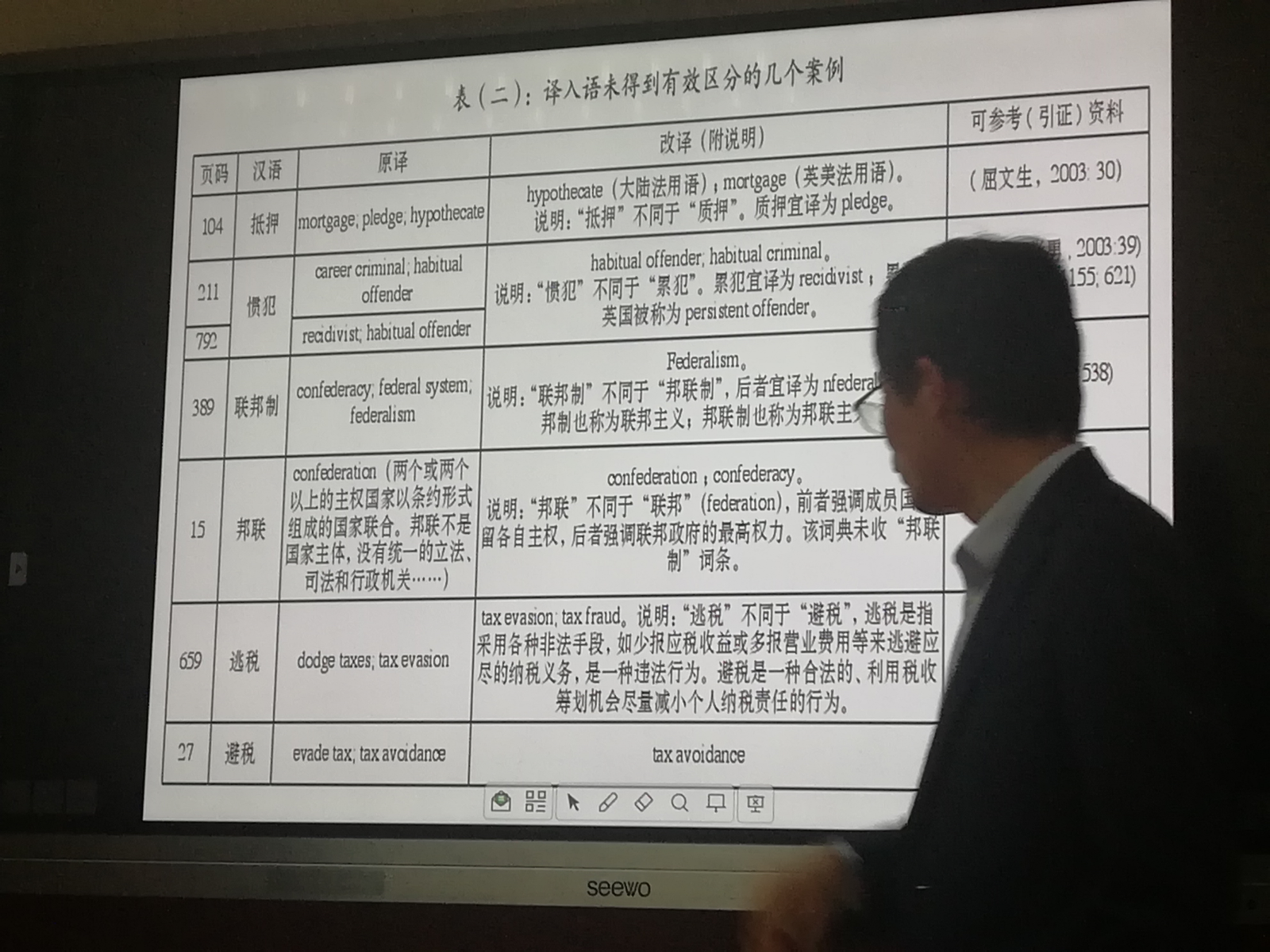 在“两步骤“原则的基础上,屈教授结合具体实例,非常丰富而又详细地讲解了法律术语翻译所涉及到的方方面面,主要分为四个部分。第一,一词多义的中文法律术语的英译问题。中文法律文本中,有些词具有多个义项,这与一般术语具备的“单名单义性”特征不符。在这种情况下,译者应根据其语境中的实际含义翻译成不同的英文术语。第二,一词多义的英文法律术语的汉译问题。英文法律文本中也存在多义词,同样要求译者联系上下文,根据其实际含义译成不同的中文术语。第三,容易混淆的中文法律术语的英译问题。如被告与被告人,起诉与上诉,判决、裁决、裁定与决定,违法与犯罪,逃税与避税,无期徒刑与终身监禁等。第四,容易混淆的英文法律术语的汉译问题。例如Act of God与Force Majeure,Subpoena与Summons,Accomplice与Accessory等,翻译成汉语时常不做区别,但译者需了解他们的原意实有差异。