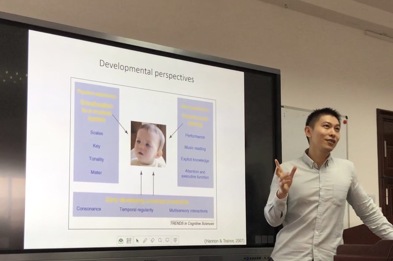 第一部分中,刘礼泉博士讲解了从妊娠中期至儿童早期年龄段间的基本发展规律、发展要素和最新研究发现。他首先对语言习得进行视野拓展,认为研究语言发展需注意儿童主体、需习得的目标,以及习得环境三者中的各种重要影响因素。然后,他列举文献显示儿童感知迅速向母语靠拢却又在出生后早期相当灵活的特点,这为双语发展奠定了基础。