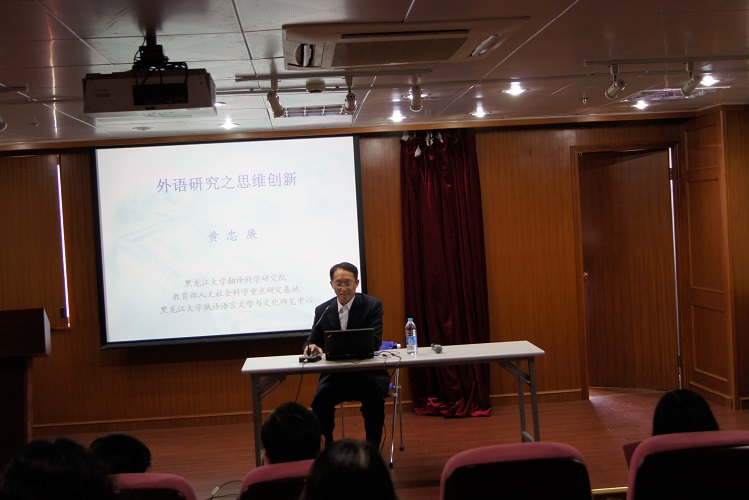 2014年4月18日,黑龙江大学翻译科学研究院院长、博士生导师黄忠廉教授应邀来到安博app登录_安博(中国),外文学院,在文科楼209室为老师们做了题为“外语研究之思维创新——从析例实践到思想犀利”的精彩讲座。此次讲座由翻译系主任蔡基刚教授主持,由此拉开了外文学院青联会之科研篇系列讲座活动的序幕。