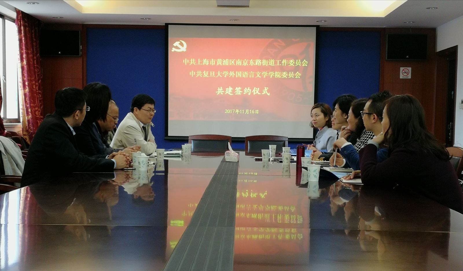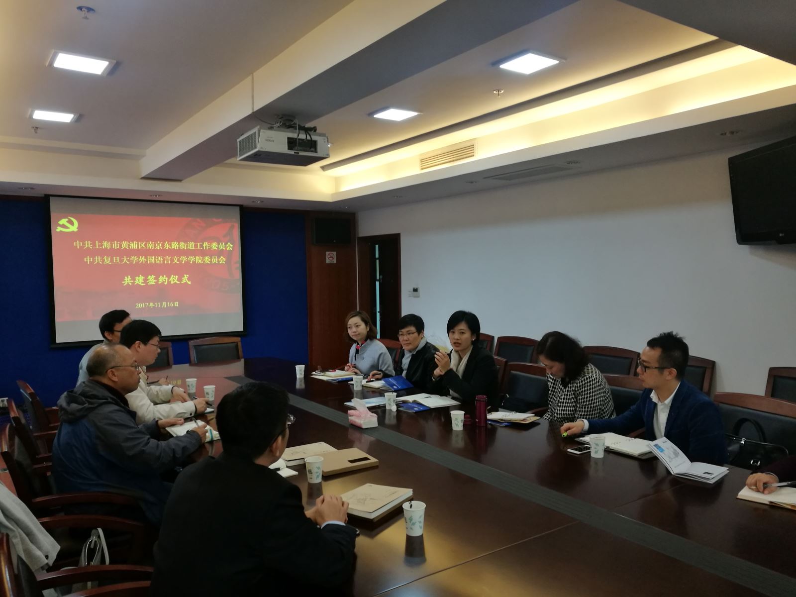 11月16日上午,黄浦区南京东路街道党工委书记张婷婷、副书记沈云、副主任茹蕾、党建办江健、党政办范杲逻、发展办王薇涛到访外文学院,共商推进党建共建工作。外文学院党委副书记曾建彬、赵昕,党委委员艾菁、翻译系党支部书记王炎强、研工组长王亚鹏等在文科楼220会议室接待南东街道一行。