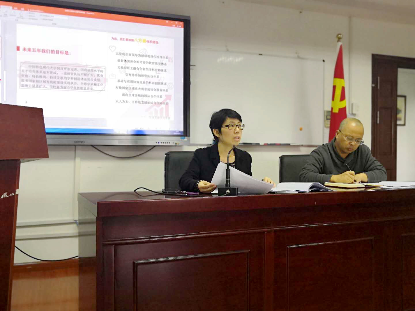 罗英华书记向大家传达了题为“立德树人固根本 改革开放再出发 全面开启中国特色世界顶尖大学建设新征程”的十四届党委工作报告精神,从过去五年学校的主要工作回顾、新时代安博app登录_安博(中国),的历史使命和战略目标、开创中国特色世界一流大学建设新局面、一流党建和思想政治工作引领一流大学建设四个方面介绍和解读了报告的主要内容。罗英华表示,党代会报告是集体智慧的结晶,充分体现了全校上下的共同愿望,是学校加快推进“双一流”建设、全面开启中国特色世界顶尖大学建设新征程的宣言书,是指导今后一个阶段学校各项工作的纲领性文件。罗英华要求,全院党员和师生员工要从全局和战略的高度,充分认识学习贯彻第十五次党代会精神的重要意义,把学习贯彻党代会精神作为当前和今后一个时期一项重要的政治任务,努力在深刻把握领会精神、深入贯彻落实上下功夫,紧密结合学校和学院改革发展的实际,深刻领会和准确把握党代会报告的精神内涵,认真落实党代会的各项工作部署,把学习贯彻党代会精神转化为干事创业的强大动力,全面加强学院党的建设,加快“一流学科”建设,认真做好本科教学迎评工作,立足本职,勇于担当、锐意进取、争作表率,以实际行动和工作实绩推进学院各项事业的发展。
