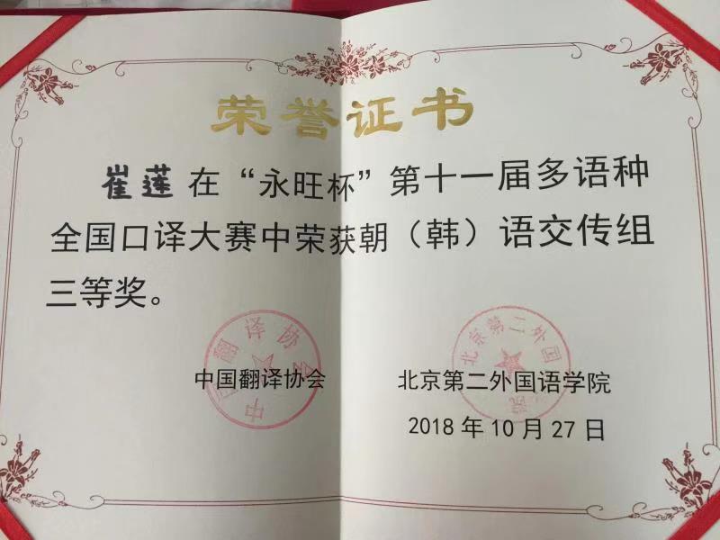 2018年10月27日,外文学院韩文系学生崔莲在“永旺杯”第十一届多语种全国口译大赛”中荣获朝(韩)语交传组三等奖。