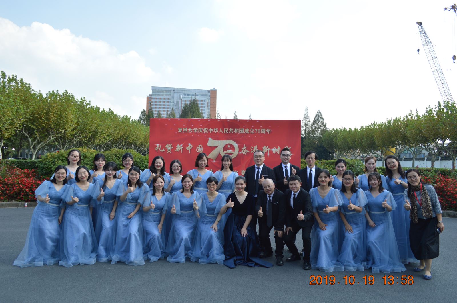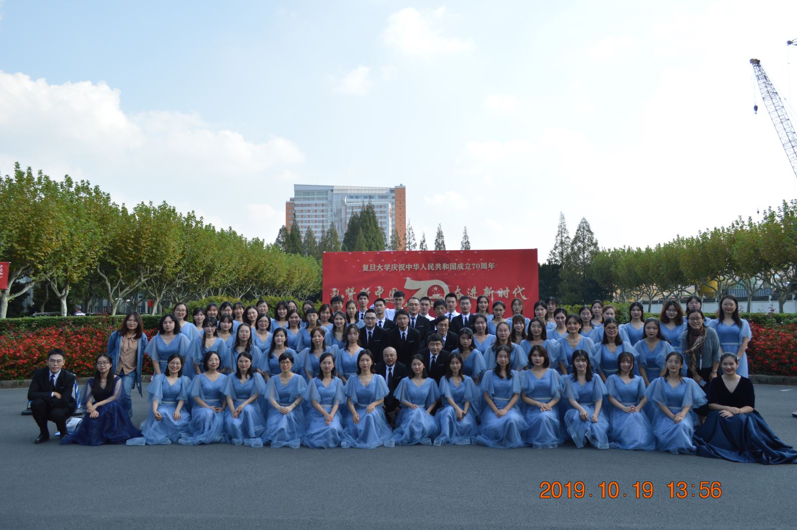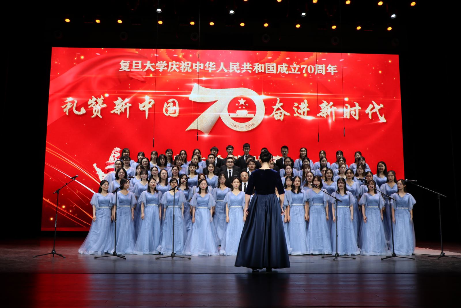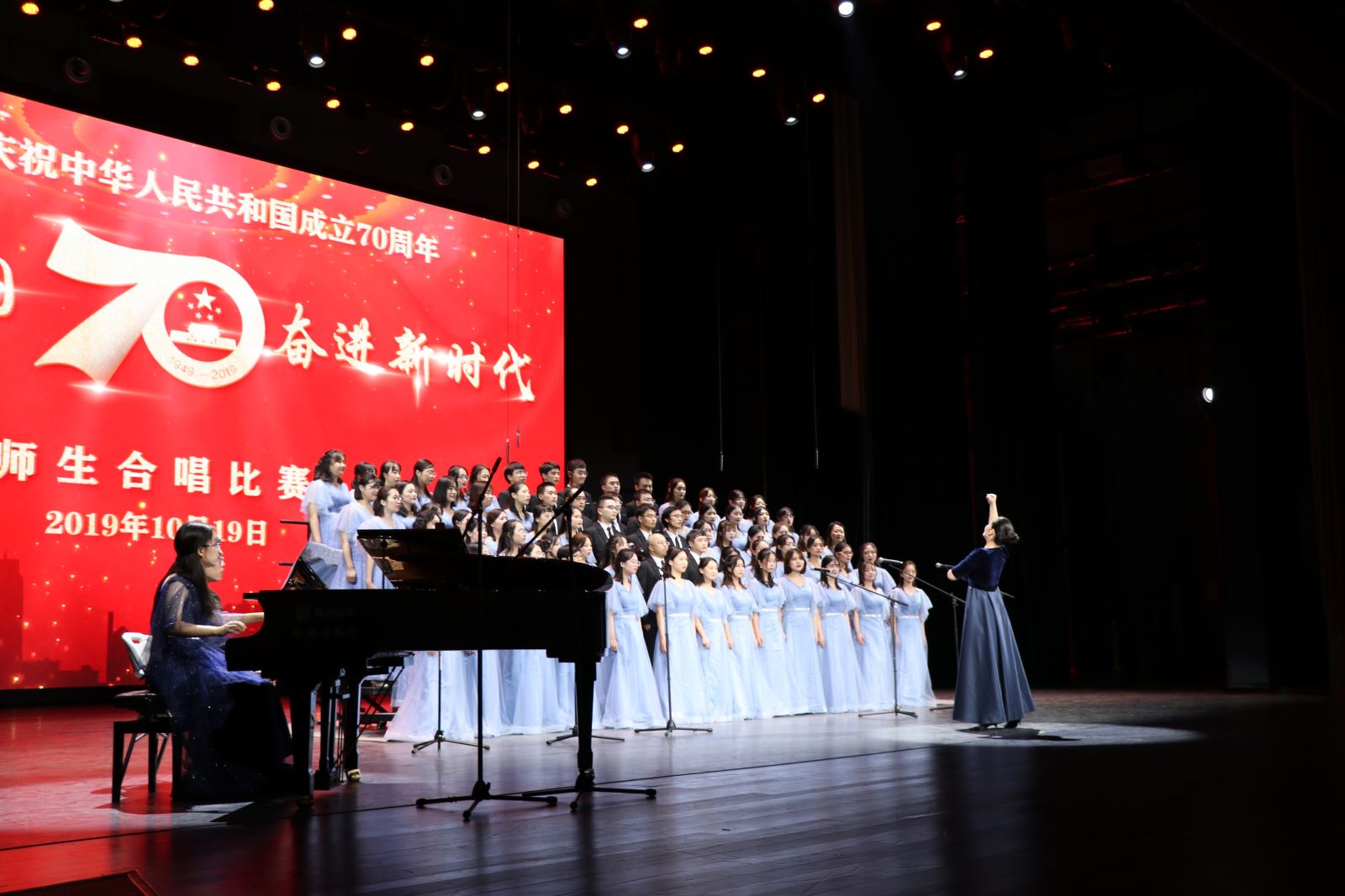 2019年10月19日,“礼赞新中国、奋进新时代”——安博app登录_安博(中国),师生庆祝新中国成立70周年师生合唱比赛在相辉堂隆重举行。外文学院合唱团参加了大合唱比赛,经过一个多月的紧张排练,师生默契十足,现场发挥稳定,赢得掌声阵阵。最后虽与奖项擦肩而过,但师生拳拳赤子心、殷殷爱国情在歌声中愈唱愈响,激励着外院师生不忘初心、砥砺向前。