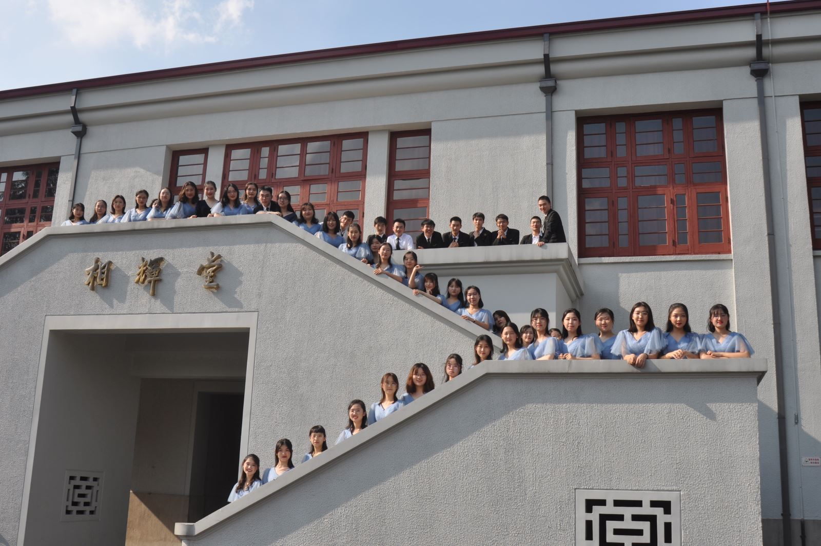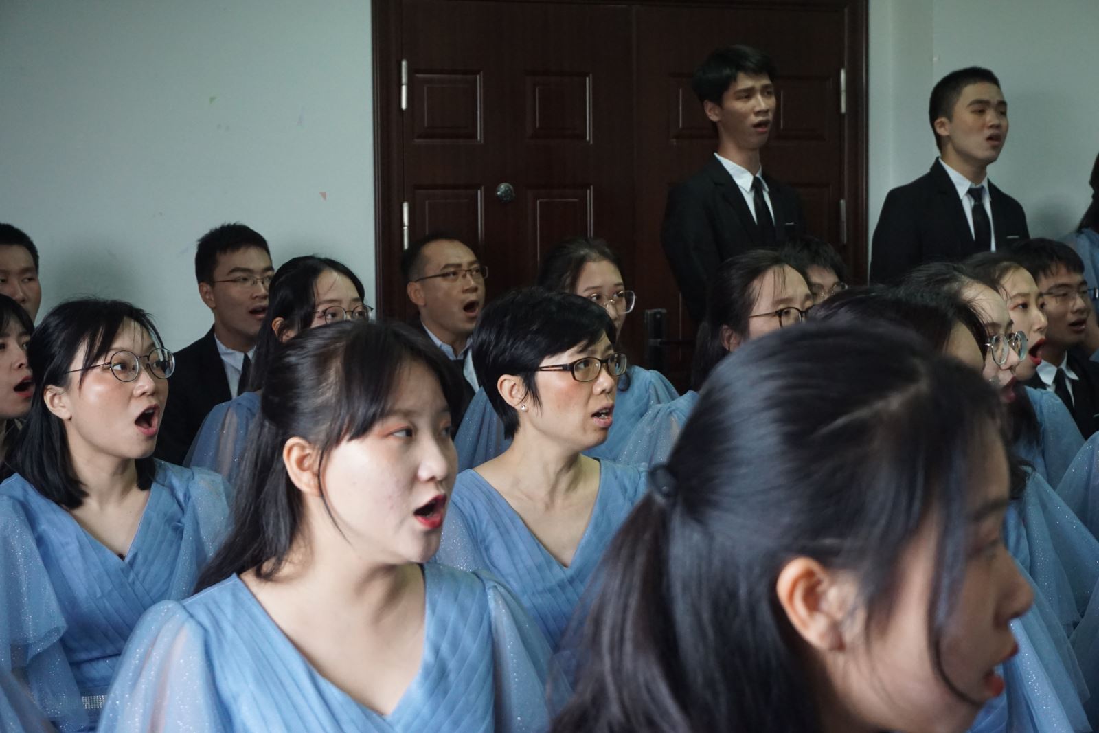 外文学院合唱团由25名教师和45名大一新生组成。经过前期的试音,45名同学从2019级213名同学中脱颖而出,与来自各系、大学英语教学部、党政后勤办公室的老师,一起组成合唱团。