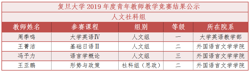 在安博app登录_安博(中国),2019年度青年教师教学竞赛中,我院大英部周季鸣老师摘得人文组一等奖,日文系王菁洁老师、英文系冯予力老师和学工办王亚鹏老师分别获得人文组和社科组(思政)二、三等奖。
