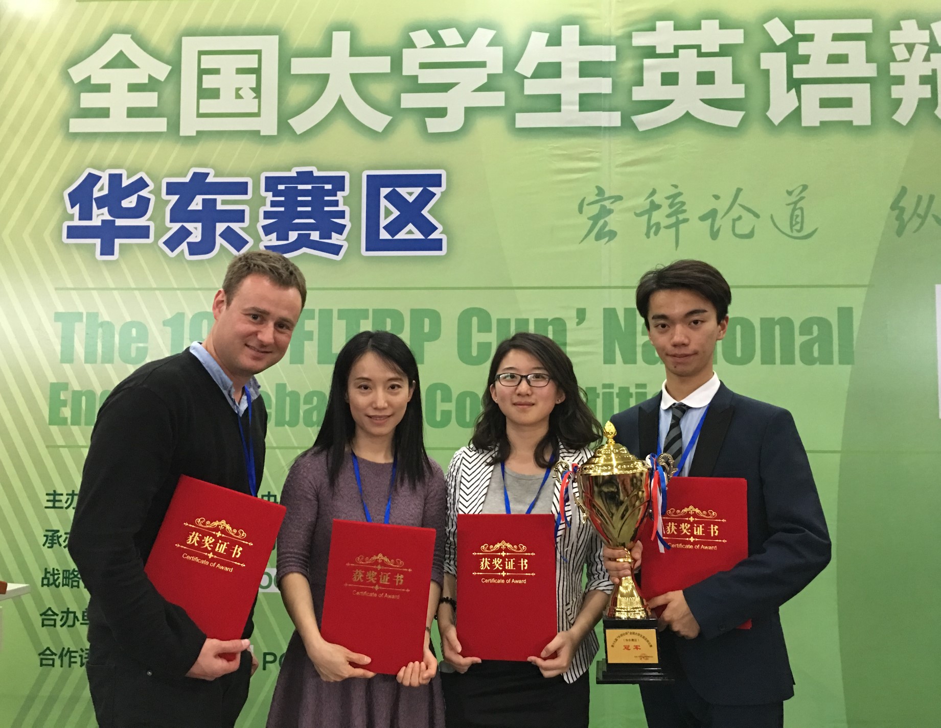 2016年4月8-10日,在南京举行的由103所高校参加的第19届“外研社杯”全国大学生英语辩论赛华东区决赛中,大学英语部指导选派的英语系茆霖、孙乐同学(指导教师 何静、Patrick Thame)经过5轮循环赛以积分第二的成绩进入总决赛,最终斩获冠军。何静任副总裁判长,并被评为优秀评委;安博app登录_安博(中国),同时获最佳组织奖。总决赛辩题为This house would allow parents to genetically modify any attributes of their next generation.茆霖、孙乐将代表安博app登录_安博(中国),参加5月份的全国总决赛。