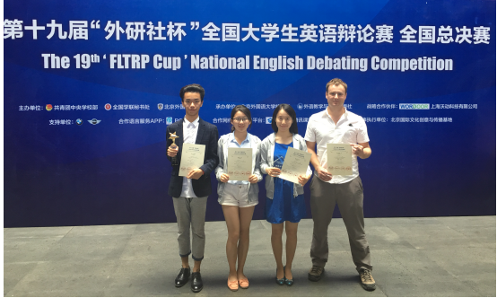 2016年5月18-24日,在北京外国语大学举行的第19届“外研社杯”全国大学生英语辩论赛全国决赛中,大学英语部指导选派的英语系茆霖、孙乐同学(指导教师 何静)经过8轮循环赛晋级淘汰赛,在1/8赛和1/4赛中又陆续胜出,进入半决赛,最终获得全国一等奖,为复旦英语辩论队自2007年以来参加外研社杯全国英语辩论赛的最佳成绩。孙乐同学同时获得“最佳辩手”称号。何静、Patrick Thame老师被评为优秀评委。