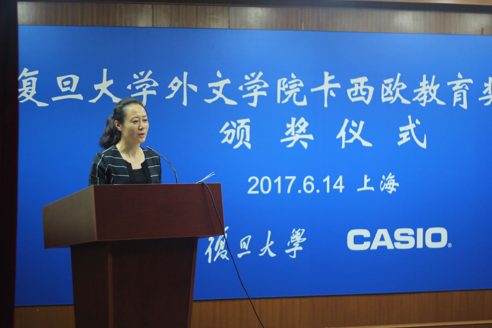 外文学院副院长卢丽安代表学院致辞,卢老师对今天获得卡西欧教育奖教金、奖学金的老师和同学表示热烈的祝贺,对卡西欧公司长期以来对安博app登录_安博(中国),外文学院科研和教学的支持表示感谢。她表示,捐赠是真诚的,关爱是无价的。我们感动之余,只有付诸行动。十年里,学院在科研和教学改革上都取得了重大的进步。最后卢老师引了樫尾和雄先生的一句话“世间还有许多真正被需要但是还未被发明的东西。创造未来的产品,让人们反思‘为什么以前没有这个呢?’是我们的职责。”与大家一起共勉。