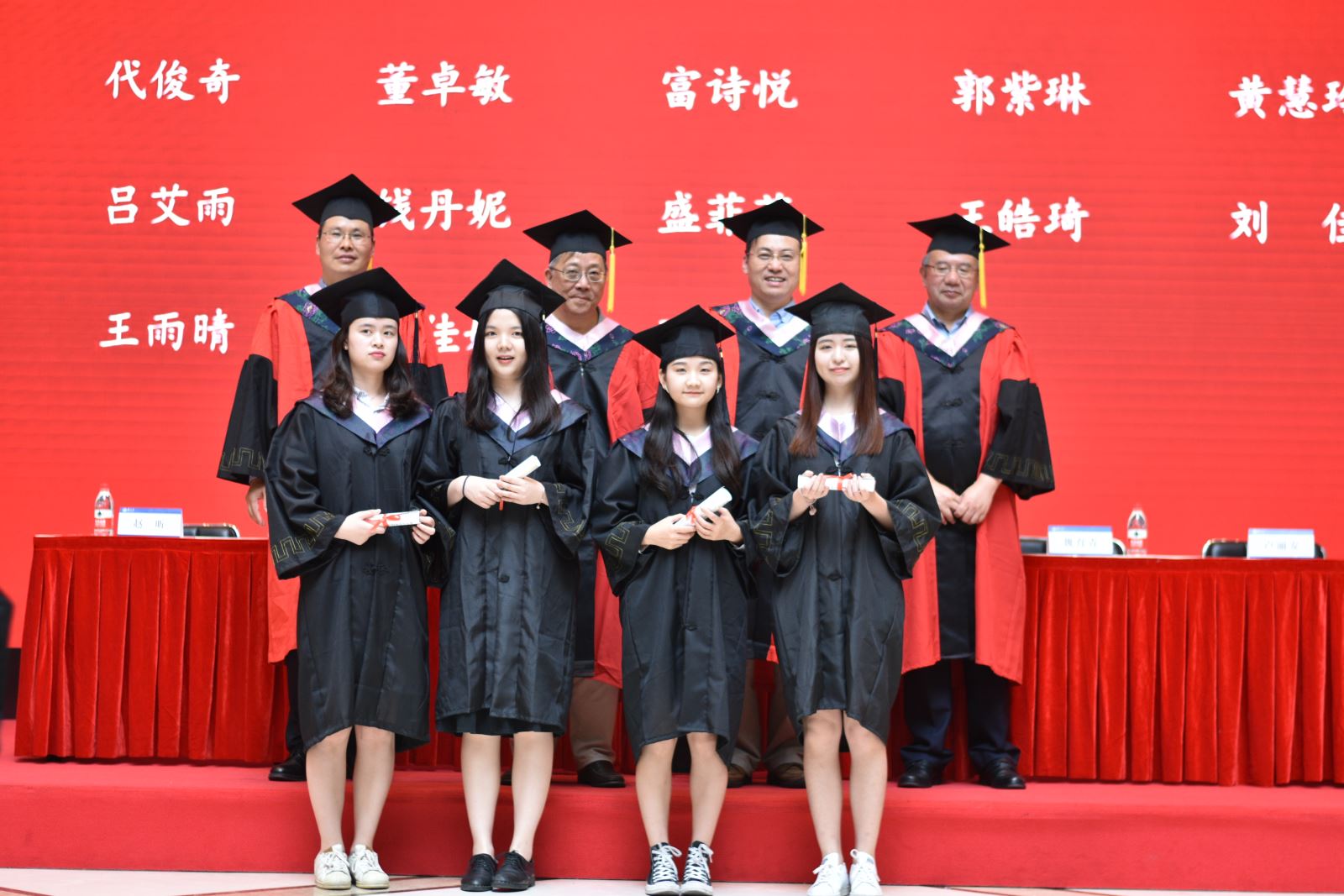 学位授予仪式上,英文系系主任朱建新老师、俄文系系主任姜宏老师、德文系姜林静老师、法文系系主任袁莉老师、日文系系主任邹波老师、韩文系系主任黄贤玉老师、翻译系王炎强老师依次上台宣读毕业生名单。